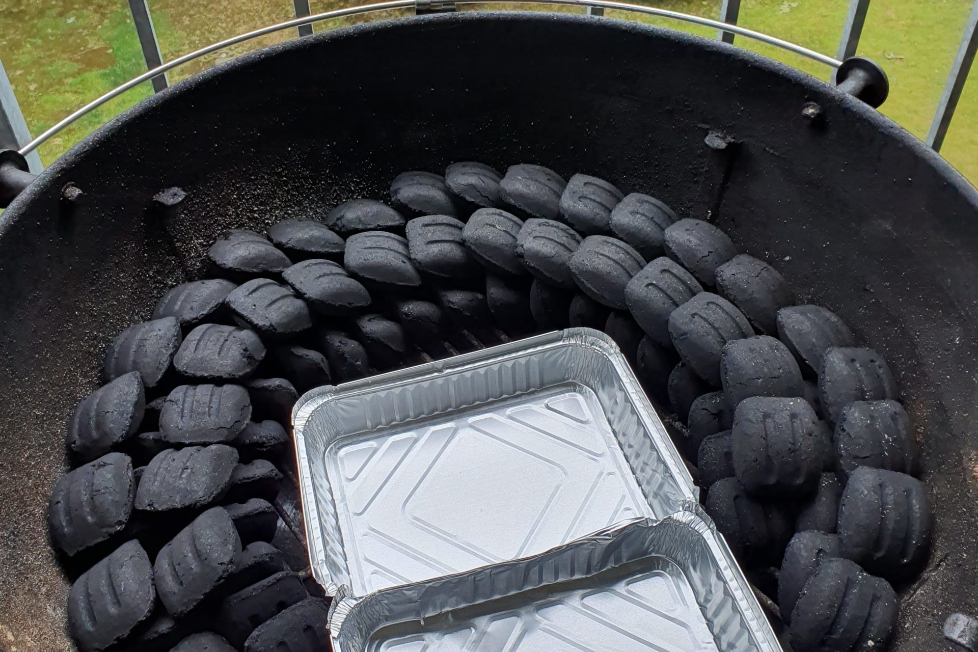Wie auf dem Bild zu sehen werden die Briketts in Reihen (wie beim Domino) in einem Kreis gelegt. Ich wähle meistens für 2 Briketts unten und 2 oben des Rings. Beim Aufbau ist es wichtig darauf zu achten, dass die Briketts sich gut berühren – nur dann brennt der Ring gut durch. Ein Ring wie er auf dem Bild zu sehen ist hält bei mit den Weber Briketts ca 16 Stunden je nach Jahreszeit mehr oder weniger.