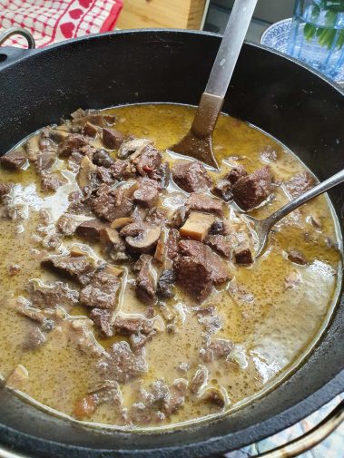 Ein schönes Wildragout aus dem Dutch Oven kriegt jedes Stück zart. Es ist einfach zuzubereiten und schmeckt eigentlich jedem. Gerade zur Herbst- und Winter-Zeit ist das Ragout ein herzenswärmender Klassiker. Ich esse meist Spätzle, Nudeln oder einfach gekochte Kartoffeln dazu – es geht immer!